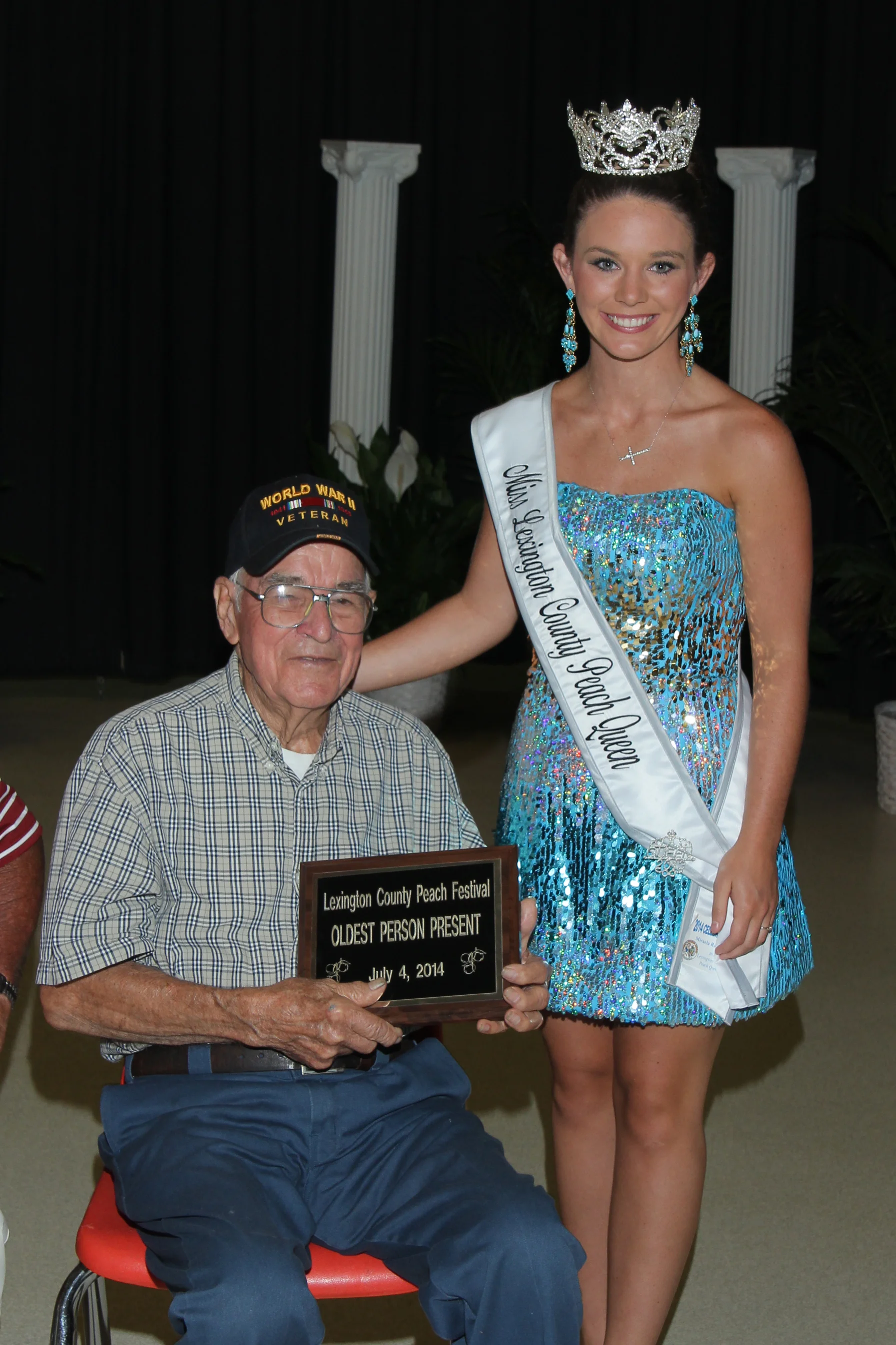 Enjoying the day's activities on July 4th may make everyone seem a winner. The Peach Queens were crowned on June 28th; however, additional winners were recognized at the 11 a.m. program on July 4th. Among those were the oldest and youngest in attendance at the 56th Lexington County Peach Festival. Receiving the award as the oldest person in attendance for the second year in a row was this year's grand marshal, George Oswald of Gilbert. In his 90s, Mr. Oswald, a World War II army veteran, served at Normandy.