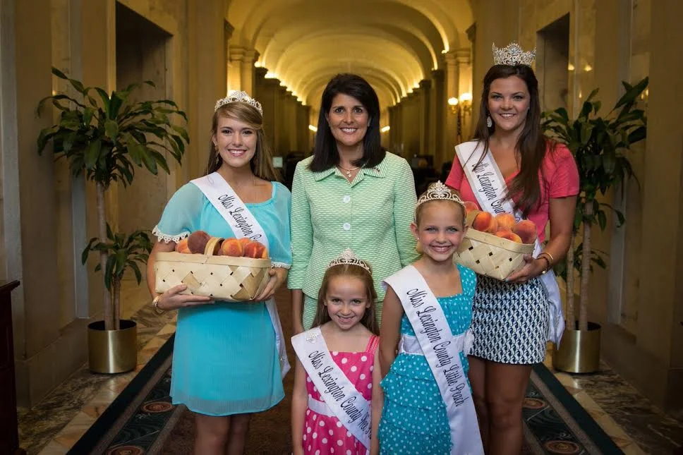 2014 Peach Queens present peaches to Governor Nikki Haley; left to right: Tessa Arquette, Governor Haley, Bailey Rowe, Sarah Adkins, and Kaylee Cuthbertson.
