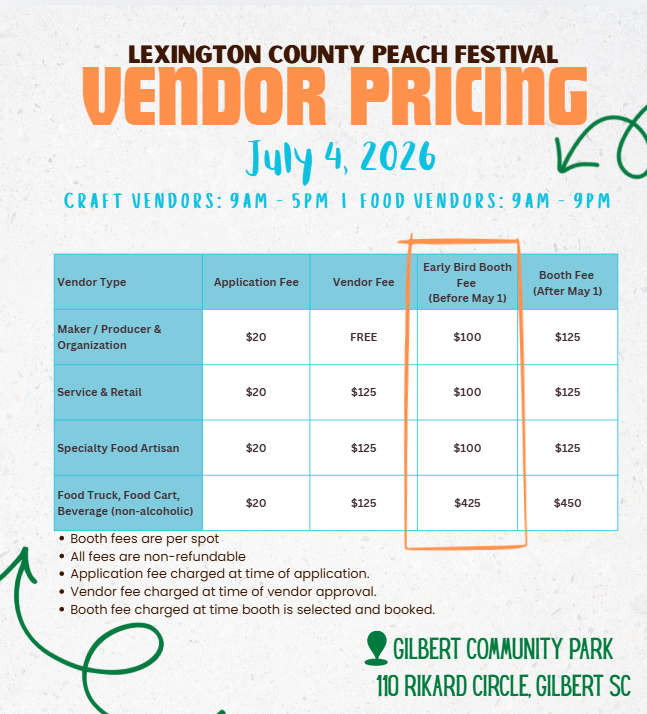 The Lexington County Peach Festival will be held on July 4, 2026 at the Gilbert Community Park in Gilbert, SC, presents an exciting opportunity for vendors with our Vendor Market event. This one-day festival emphasizes a producer-focused approach, welcoming local and regional artisans, makers, and growers to showcase their unique crafts, upcycled goods, and homemade products. With approximately 140 craft vendor spaces available and 16 food truck spaces available, the event prioritizes those who create, refurbish, or grow their offerings, aiming to elevate the experience for both vendors and festival-goers. Commercial and retail vendors are also invited to apply, but priority is given to those who bring something new and interesting to the event. Don't miss this chance to be part of a vibrant, community-celebrated festival, where your products can shine alongside the beloved peach-themed festivities.